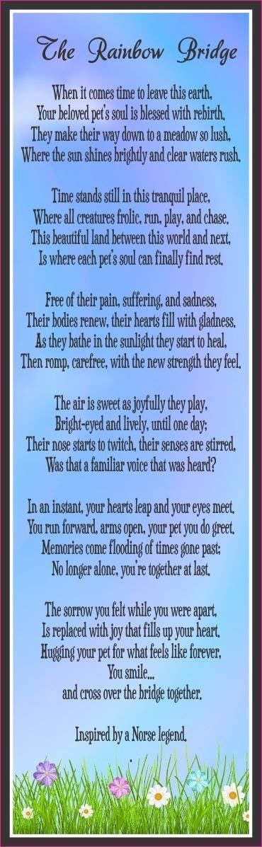 The rainbow bridge poem celebrates the special and everlasting bond we make with our pets, while also celebrating our pet's life and personality. When an animal dies that has been especially close to someone here, that pet goes to rainbow bridge. Caressa entered our lives when christina was 12 years ol… 5 out of 5 stars. It is called the rainbow bridge because of all its beautiful colors. It is called the rainbow bridge because of all its beautiful colors. Free 8.5in x 11 in printable rainbow bridge poem. There is plenty of food, water and sunshine, and our friends are. When a beloved pet dies, the pet goes to this place. Just this side of heaven is a a magical place called rainbow bridge These cats all hold very special places in the hearts of their families. There is plenty of food, water and sunshine, and our friends are. There is a bridge connecting heaven and earth.